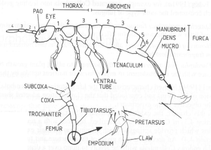 De Klasse Collembola, als monofyletische groep, wordt gekenmerkt door een ventrale tubus en een springorgaan, de furca, sommigen vertonen een secundaire reductie van het laatstgenoemde. De antennen bestaan uit vier segmenten, welke soms onderverdeeld in subsegmenten, en er zijn zes abdominale segmenten, vergroeid bij Neelipleona en Symphypleona.