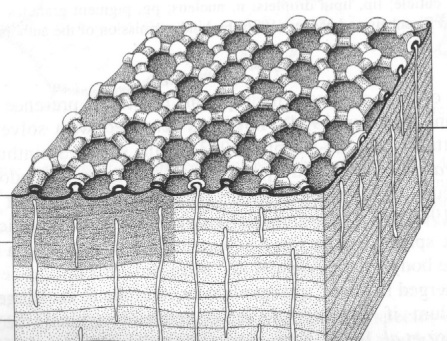 Figuur 3: Schematische voorstelling van de cuticula van Collembola. De poriekanaaltjes, die de lamellae doorkruisen, eindigen in microtuberkels (Eisenbeis & Wichard, 1987).
