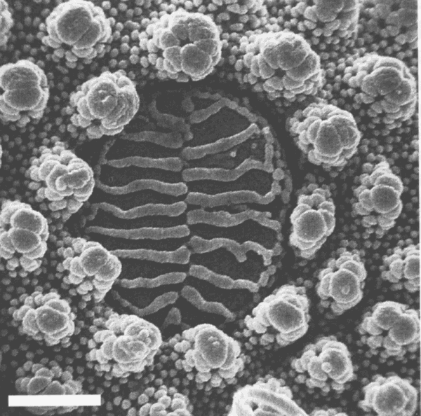 Figuur 4: SEM van een peudocellus van Protophorura sp. (Onychiuridae). Defensieve vloeistof wordt uit deze poriën geperst wanneer het dier geïrriteerd is. Het aantal en de positie van pseudocelli wordt extensief gebruikt in de taxonomie der Onychiuridae. Schaalbalkje = 3µm. (Hopkin, 1997).
