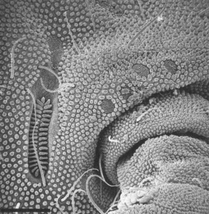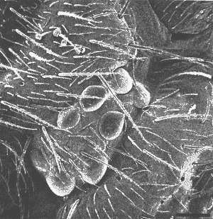 Met behulp van een elektronenmikroscoop ziet men dat het basispatroon van de cuticula een hexagonale schikking is van driehoekige granules met lineaire verbindingen ertussen (Massoud & Barra, 1980; Figuur 3). De granules kunnen gereduceerd zijn, zodat een relatief glad oppervlak bekomen wordt of ze kunnen samengesmolten en vergroot zijn zodat secundaire granules gevormd worden (Cassagnau & Lauga-Reyrel, 1985).
