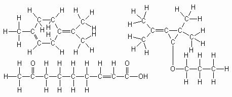 Figuur 10: Enkele voorbeelden van vluchtige, chemische geurstoffen. A: Algemeen voorkomend alarmferomoon bij termieten. B: Een seksferomoon bij een kakkerlaksoort (Periplatena americana). C: Een substantie van de honingbijenkoningin (Apis mellifera).