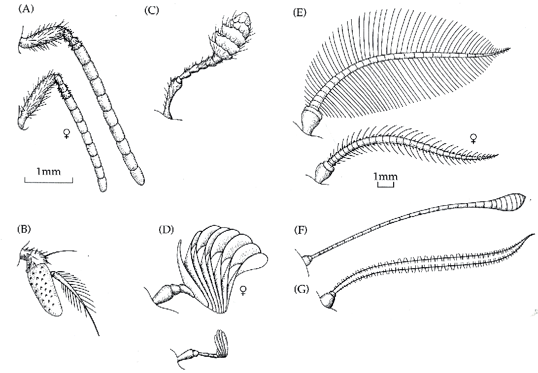 Figuur 11: Antennae van diverse insecten: (A) de mannelijke en vrouwelijke honingbij (Apis mellifera), (B) de vleesvlieg (Sarcophaga), (C) de aaskever (Necrophorus), (D) de mannelijke en vrouwelijke mestkever (Rhopaea), (E) de mannelijke en vrouwelijke nachtpauwoog (Antheraea), (F) de nummervlinder (Vanessa) en (G) de pijlstaartvlinder (Pergesa). Dezelfde schaal werd gebruikt voor A-D en E-G (naar Kaissling, 1971).