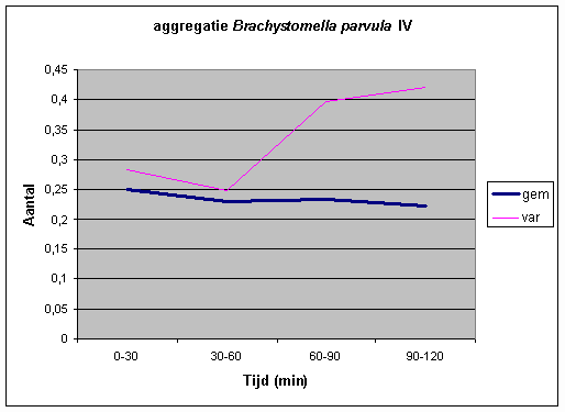 Bijlage 10: Grafiek van gemiddelde en variantie in de loop van de tijd bij Brachystomella parvula. Na 60 min. Is de variantie duidelijk groter dan het gemiddelde, men kan aannemen dat de springstaarten geaggregeerd zijn.