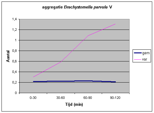 Bijlage 12: Grafiek van gemiddelde en variantie in de loop van de tijd bij Brachystomella parvula. De variantie is groter dan het gemiddelde, de collembolen aggregeren.
