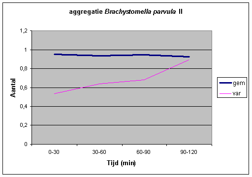 Bijlage 6: Grafiek van gemiddelde en variantie in de loop van de tijd bij Brachystomella parvula. De variantie is kleiner dan het gemiddelde, de springstaarten komen de eerste twee uur niet geaggregeerd voor. Na twee uur zou de populatie geaggregeerd kunnen zijn, als de variantie blijft stijgen.