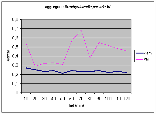 Bijlage 9: Detailgrafiek van gemiddelde en variantie in de loop van de tijd bij Brachystomella parvula. Na een uur zijn de collembolen geaggregeerd, daar de variantie groter is dan het gemiddelde.