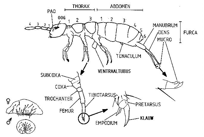 Collembola zijn kleine, vleugelloze Hexapoda. Hun lichaam bestaat uit een cephalon, een thorax en een abdomen (fig.2.2). Ze zijn bedekt met haren (setae) of schubben (gemodifieerde haren) van verschillende vorm. Vaak is het aantal en de schikking hiervan karakteristiek op soortniveau.