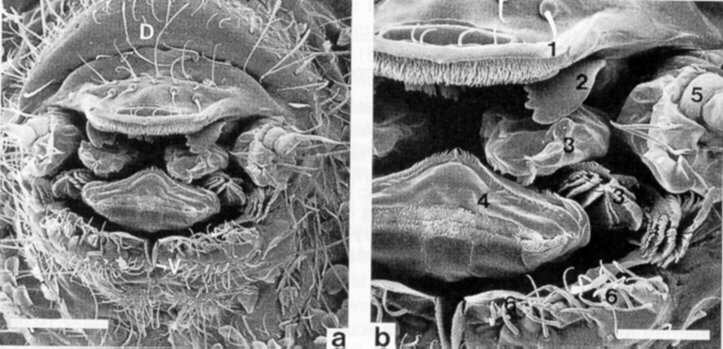 De kopstreek wordt gekenmerkt door interne monddelen, primair vierledige antennes, ogen en twee postantennale organen. De monddelen zijn samengesteld uit een paar inwendige mandibels en maxillen. De mondholte wordt afgesloten met het labrum. Het entognaath zijn van de monddelen van Collembola zou volgens Manton (1964) onafhankelijk zijn ontstaan van de Diplura en de Protura. Daarom hecht ze weinig fylogenetisch belang aan de groep Entognatha. Andere auteurs zoals Hennig (1969,1981) en Kristensen (1981) maken nog steeds onderscheid tussen Ectognatha (Thysanura en Pterygota) en Entognatha (Protura, Diplura en Collembola) (fig.2.3).