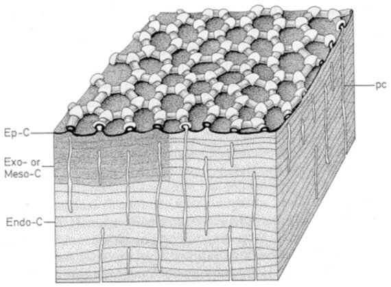 Fig. 2.4 Schematisch diagram van de cuticula van collembolen. Ep-C, epicuticula; Exo, exocuticula; Meso-C, mesocuticula; Endo-C, endocuticula. De kanaalporiën (pc) doorkruisen de lamellen van de cuticula en eindigen in de microtuberkels. Door Eisenbeis en Wichard (1987).