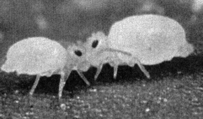 Fig. 2.9 ‘Flirtend’ paar van een mannelijke (links) en vrouwelijke (rechts) Bourletiella hortensis (Sminthuridae). Het vrouwtje is bij benadering 1 mm lang. Foto door Steve Hopkin.