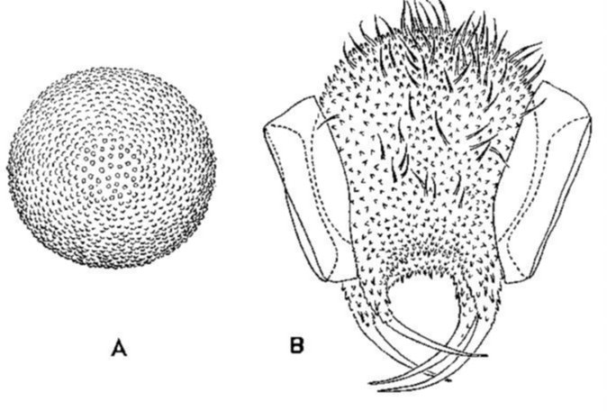 Fig. 2.5 Anurida maritima. A: mannelijke genitale plaat, B: vrouwelijke genitale plaat.