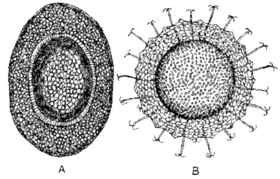 A: Drijvende statoblast van Hyalinella punctata. B: Statoblast met haken van Crisatella mucedo.
