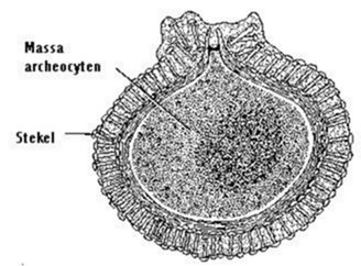 Fig. 3.2 Doorsnede van een gemmula van een zoetwater spons. (naar Evans van Hyman).