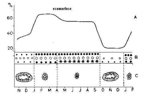 Fig. 3.4 Schema van de seizoengebonden cyclus van het verschijnsel ecomorfose bij Hypogastrura tullbergi (naar Lauga-Reyrel, 1979)