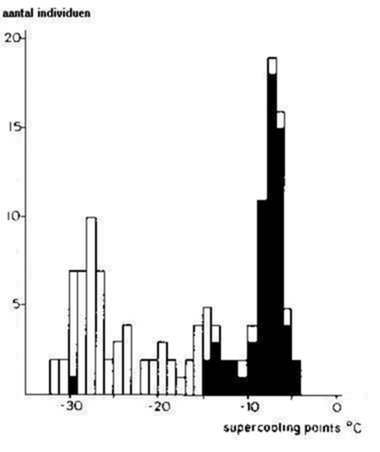 Ook springstaartsoorten van gematigde streken zijn metabolisch voorbereid op de koude winter. Individuen van verschillende soorten vertonen een veranderende tolerantie voor lage temperaturen (fig.3.7).