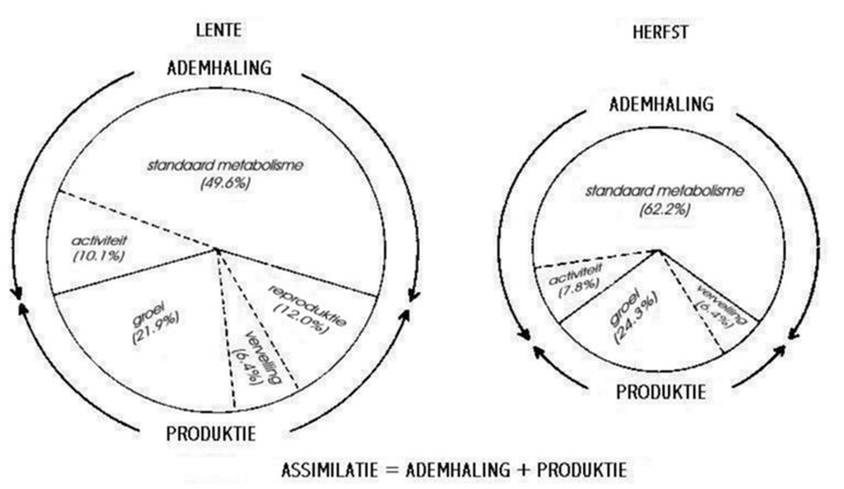 In figuur 3.8 is te zien dat de cirkel van de herfst smaller is. Verder is ook de energieverdeling verschillend in de lente en de herfst: naar de winter toe wordt meer energie geïnvesteerd in het behoud van het metabolisme en de reproduktie wordt volledig stopgezet. Deze strategie zou afwezig zijn in dieper levende soorten (Verhoef & Li, 1983).