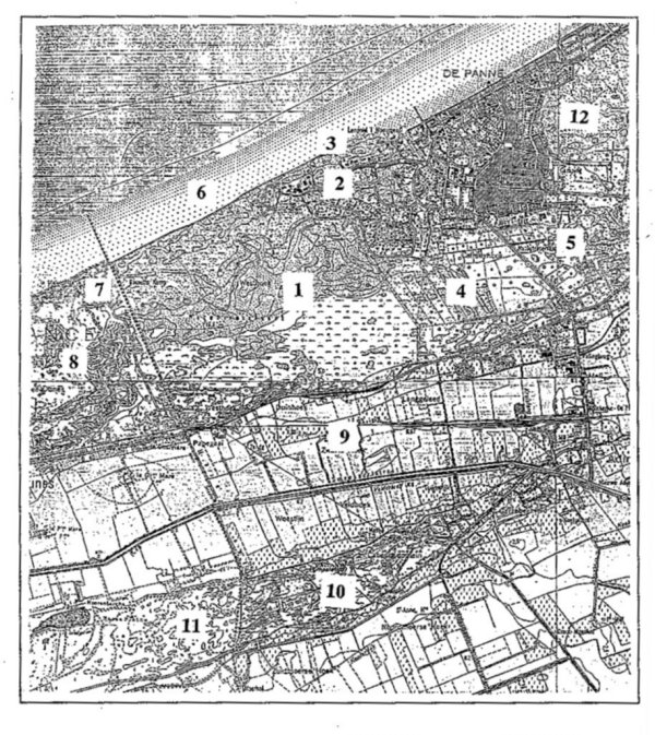 1 = staatsnatuurreservaat "De Westhoek"; 2 = Westhoekverkaveling (Vissersdorp); 3 = zeereepduinen De Panne; 4 = Calmeynbos + duinen (waterwinning); 5 = Oosthoekduinen; 6 = strand12 = staatsnatuurreservaat "Houtsaeger"; 7 = camping "le Perroquet"; 8 = Dunes du perroquet; 9 = polder; 10 = Cabourg-domein; 11 = Dunes Fossiles de Ghyvelde
