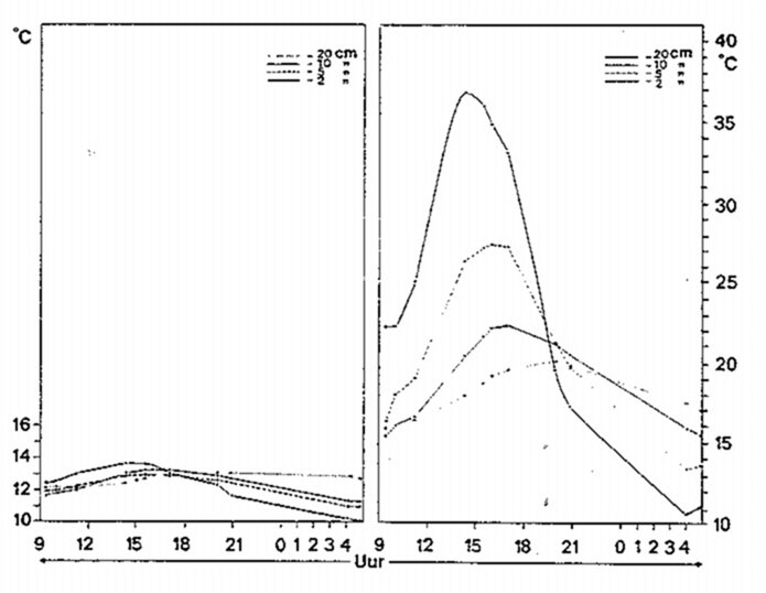 Fig. 4.2 Bodemtemperaturen tussen 13 juni 1958, 9.00h en 14 juni, 5.00h in duizand onder duindoornstruweel (links) en in kaal duinzand (rechts) (Stoutjesdijk 1961).