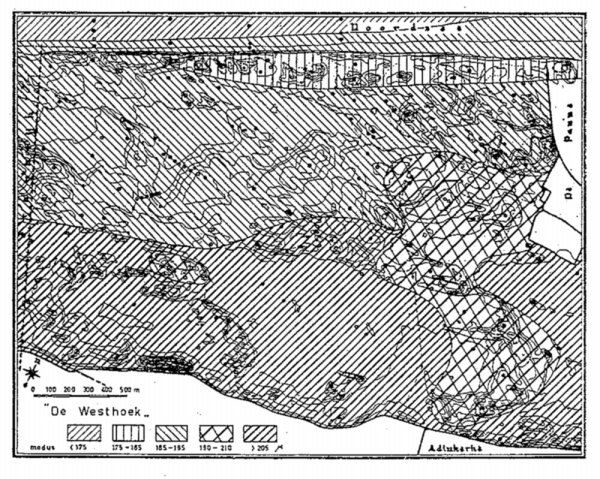 Fig. 4.3 Moduswaarden van de oppervlaktezanden in de Westhoek (uit Depuydt, 1966)
