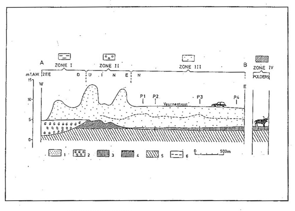 Fig. 4.4 Schematische doorsnede doorheen de Westhoek, van het strand tot aan de polders (uit De Ceunynck, 1987).