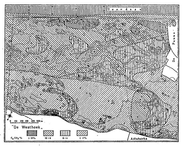 Fig. 4.5 Kalkgehaltebepaling van de Westhoeksedimenten, die zich voordoen aan het huidig evoluerend oppvlak (uit Depuydt, 1966).