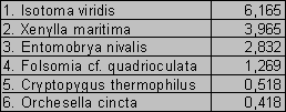 In totaal werden meer dan 11600 springstaarten gevangen, behorende tot 18 verschillende soorten. Tabel B.1 (B=bijlage) geeft een overzicht van de ruwe data. De zes meest abundante soorten worden weergegeven in tabel 6.1. Het betreft de volgende soorten: Isotoma viridis, Xenylla maritima, Entomobrya nivalis, Folsomia cf. quadrioculata, Crytopygus thermophilus en Orchesella cincta. De Sminthuridae worden uiteraard buiten beschouwing gelaten, daar het hier niet om een soort gaat, maar om een familie. De soorten behorende tot deze familie zijn vaak zeer klein en daarom moeilijk te determineren. De verdere verwerking zal hoofdzakelijk betrekking hebben op Isotoma viridis, Xenylla maritima en Entomobrya nivalis.