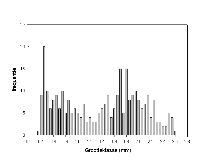 In totaal zijn 302 specimens gemeten met een lengte variërend van 0.338 mm tot 2.547 mm. Wanneer we de extensie van 13% ten gevolge van de fixatie in rekenschap brengen, bekomen we een lengte tussen 0.382 mm en 2.878 mm. De resultaten zijn terug te vinden in tabel B.15. De bekomen lengtes zijn verdeeld over 56 klassen met een klassebreedte van 0.05 mm, beginnende met de waarde 0.3 mm en eindigend met de waarde 3.0 mm. Tabel B.16 geeft het aantal collembolen per grootteklasse weer voor elke periode. In functie van de lichaamslengte is een frequentieverdeling opgesteld, welke te zien is in figuur 6.6. Het is niet uitgesloten dat de opeenvolgende pieken van de grafiek corresponderen met de instars. De eerste stijging van deze bimodale verdeling kan verklaard worden door het feit dat het hier gaat om pas uitgeslopen juvenielen, die nog niet veel aan levensbedreigende omstandigheden zijn blootgesteld. In functie van de toenemende ouderdom zal een daling van het aantal individuen optreden. Dit verklaart tevens de lage frequenties van de individuen groter dan 2.2 mm. De hoge reproductieve activiteit van de adulten is verantwoordelijk voor de frequentiestijging vanaf een lengte van 1.35 mm, daar de vangstopbrengst een functie is van de activiteit. Berbiers (intern rapport) toonde aan dat Isotoma viridis reproductief wordt bij het 10de instar. Bij het bereiken van dit instar, bedraagt de standaardlengte 1.30 (±0.17) mm. Globaal vertoont de groei van springstaarten een sigmoidaal verband. Dit houdt in dat er een geringere groeisnelheid is bij groter wordende individuen. De lage frequentie van de grootteklassen tussen 1.15 mm en 1.35 mm kan toegeschreven worden aan een aantal factoren. Allereerst komt dit lengte-interval overeen met de periode net voor het bereiken van de sexuele rijpheid. De individuen zijn wel actief, maar niet zo uitgesproken als in de reproductieve fase. Ten tweede wordt die periode gekenmerkt door een hoge groeisnelheid. Een ongeveer maandelijkse bemonstering kan dan al vlug enkele grootteklassen over het hoofd zien. Een derde factor is de reeds vermelde afname van het aantal individuen met toenemende leeftijd. De combinatie van een lage activiteit, een hoge groeisnelheid en een relatief lagere densiteit is verantwoordelijk voor het dieptepunt van de verdeling.