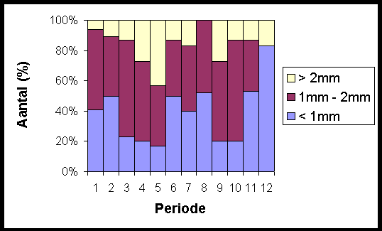 Figuur 6.8 geeft aan dat 64% van de specimens gevangen in maart een lichaamslengte hebben tussen 1 mm en 2 mm, 13% is groter en 23% is kleiner. Deze najaarsgeneratie geeft leven aan een nieuw nageslacht vanaf mei. In deze periode kennen de adulten een snelle groei en tegen de eerste helft van mei is 43% van de gevangen specimens groter dan 2 mm, terwijl slechts 17% tot de kleinste individuen behoort. Twee maanden later is de situatie omgekeerd: er zijn slechts 17% grote individuen verzameld en 40% juvenielen (< 1 mm). De najaarscohorte is nu aan het uitsterven en wordt vervangen door de generatie uitgekomen in mei. Tegen september heeft 80% van de vangstopbrengst een lichaamsgrootte langer dan 1mm. Op dit moment is de groottesamenstelling van de vangstopbrengst nagenoeg gelijk aan deze van april.