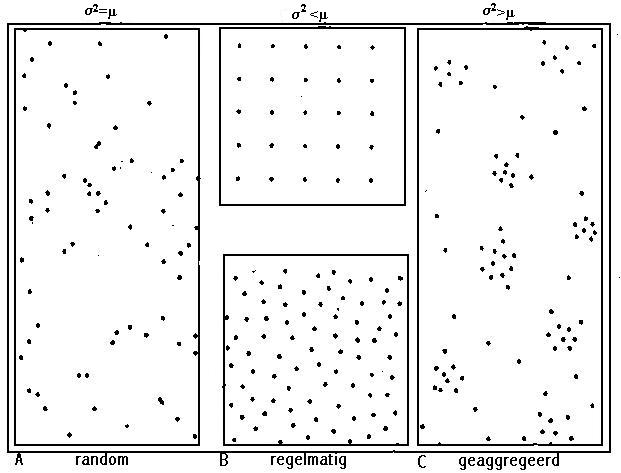 Bij een gegeven gemiddelde densiteit (x), wordt de mate van aggregatie van de te onderzoeken soort weergegeven door de variantie (s²) van de vangstaantallen tussen de verschillende staaleenheden (31). Men spreekt van een geaggregeerde verspreiding wanneer het gemiddelde kleiner is dan de variantie. Wanneer deze twee grootheden gelijk zijn, is er sprake van een toevallige dispersie en bij een gemiddelde groter dan de variantie, wordt een regelmatige verspreiding bekomen (fig.6.9). De verwachte aggregaatvorming kan aangetoond worden bij de drie meest voorkomende soorten, namelijk Isotoma viridis, Entomobrya nivalis en Orchesella cincta.