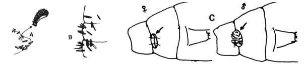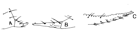 2(1). Males (fig.2c) with many peculiar heavy short spines or feather like setae (fig.2a&b)........................... 3 Males without many peculiar heavy short spines or feather like setae or females only (fig.2c)..................... 5 |