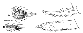104(103). Abdomen with peculiar dorsal, terminal, dental swelling (fig.66)........................................... Aackia Abdomen without peculiar dorsal, terminal, dental swelling.. ..................................................... 105 |