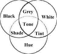 Colour : is a common term that may refer to pure, compound, and complex colours. Pure colours are black, white, and hues such as red, green, or blue. Notice black and white are not hues. A compound colour is a mixture of black and white, called grey. Or a mixture of a hue with black and/or white, called shades, tints and tones of that hue (see Fig. Colour). A complex colour is a mixture of two or more pure colours, compound colours, or pure colours with compound colours.