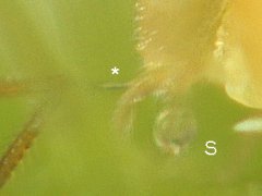 Male 'pulling' female by a thread (*) of spermcapsule (S) material