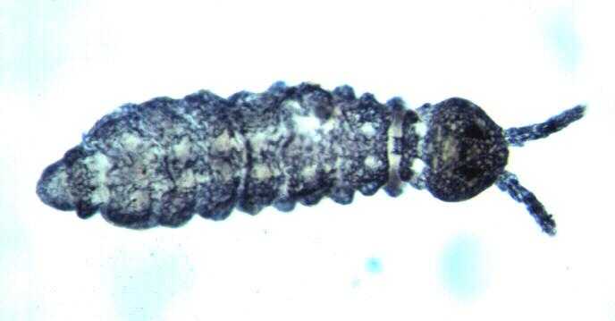 - 1.5 mm. Grau-blau. Abd. V und VI dorsomedian mit stärkerer Hautkörnung. Ant. IV mit 3-4 äusseren und 2-3 inneren Riechhaaren. Klaue mit Innen-, ohne Seitenzahn. Tibiotarsus ohne Keulenhaar.