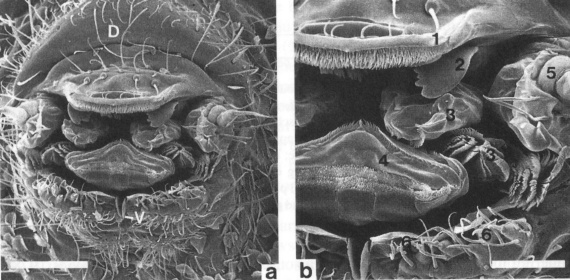 zijnde een labrum (bovenlip), een paar mandibulae (bovenkaken), een paar maxillae (onderkaken), een hypopharynx (onpare tong) en een labium (onderlip). De maxillaire palpen of kaaktasters vindt men beiderzijds van dit complex. De monddelen zijn dorsaal ingesloten door het labrum, ventraal door het labium en lateraal door de pleurale plooien van de cuticula (Figuur 2). De toppen van de mandibels zijn sterk getand, waarmee voedsel van het substraat geschraapt kan worden (Christian, 1989).