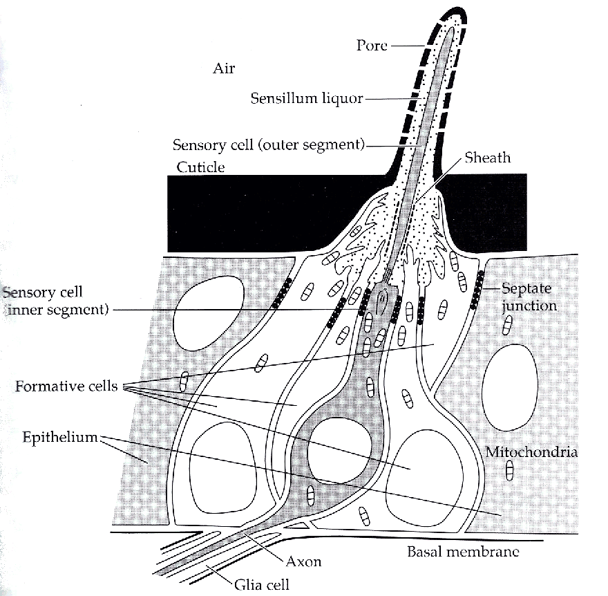 Figuur 12: Een olfactorisch sensillum van een insect. Een olfactorisch sensillum gelijkt op een eenvoudige haar, maar bij een haar zijn er poriën aan de oppervlakte, die toelaten dat olfactorische moleculen naar binnen kunnen. Aan de binnenkant baadt het uitstekend segment van één van de drie sensorische cellen in een vloeibaar medium. De sensorische cellen zijn direct verbonden met de hersenen (naar Kaissling, 1971).