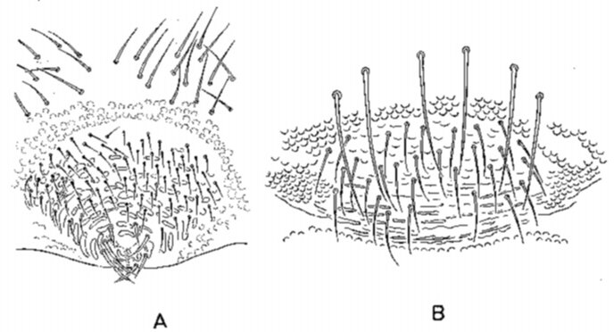 Fig. 2.5 Anurida maritima. A: mannelijke genitale plaat, B: vrouwelijke genitale plaat.
