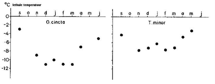 Ook springstaartsoorten van gematigde streken zijn metabolisch voorbereid op de koude winter. Individuen van verschillende soorten vertonen een veranderende tolerantie voor lage temperaturen (fig.3.7).
