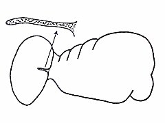 Digestive system. The begin of the digestive tract opens in the buccal cavity of the head capsule (Nicolet, 1842:46). The tubular intestinal canal passes straight through the body without any circumvolutions from anterior to posterior end (Nicolet, 1842:46). While Nicolet (1842:46) identifies five intestinal regions, they fall in three main divisions (Von Olfers cited from Lubbock, 1873:74). The alimentary canal consists of a rather long and narrow foregut or stomodeum, a capacious sac-like midgut (stomach, ventriculus, intestine) or mesenteron, and a narrow hindgut (caecum, rectum) or proctodeum (after Nicolet, 1842:46-47; Lubbock, 1873:74; Thibaud, 1970:151; Adams & Salmon, 1972:279). The foregut comprises at least the pharynx and oesophagus (Thibaud, 1970:151). A temporary local dilatation of the oesophagus may be present as result of the feeding process (Nicolet, 1842:46). Adams & Salmon (1972:279) distinguish in the fore gut: pharynx, oesophagus, crop and gizzard. The foregut and hindgut are lined with cuticle which is shed at every moult (Thibaud, 1970:152). The midgut is lined with epithelial microvilli in direct contact with a peritrophic membrane that is secreted by a ring of cells posterior to the junction between the foregut and midgut (Hopkin, 1997:60). At the junction between midgut and hindgut, a muscular sphincter, known as the pyloric region (Nicolet's 'intestin grêle') (Nicolet, 1842:46-47; Dallai 1980 cited from Hopkin 1997:62) or rectal valve (Adams & Salmon, 1972:281), is situated. Tiny 'malpighian papillae' are present at the anterior end of the hindgut (Dallai, 1980 cited from Hopkin, 1997:60). Note that the observation of malpighian vessels by Nicolet (1842:47) and Von Olfers (cited from Lubbock, 1873:75) is neither confirmed by Laboulbéne (1864 cited from Lubbock, 1873:75) nor Lubbock (1873:74,75) and definitly refuted by Dallai (1980 cited from Hopkin, 1997:60). The midgut is surrounded by a network of circular and longitudinal muscles (Nicolet, 1842:47; Lubbock, 1873:75) which mix food in the lumen and force residues of digestion into the hindgut by peristaltic movement (Nicolet, 1842:47; Dallai et al. 1989 cited from Hopkin 1997:60). The strongly muscular rectum, being provided throughout its whole length with transverse muscles (Lubbock, 1873:76) forms the faecal pellets (Hopkin 1997:63). The end of the digestive tract opens via the anus on the sixth abdominal segment (Nicolet, 1842:38,47) which bears three eversible anal sacs of unknown function (Leinaas 1988 cited from Hopkin 1997:50); anal sacs in retracted condition (Janssens, F. © 1999), anal sacs in eversed condition (Reed, D. © 2007.03.10).