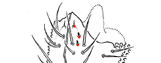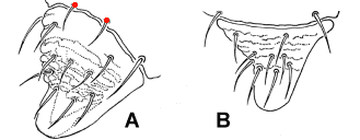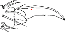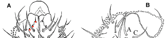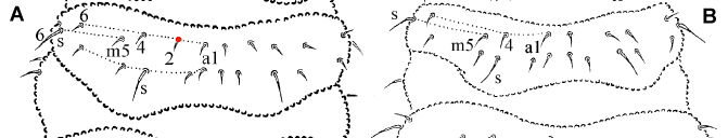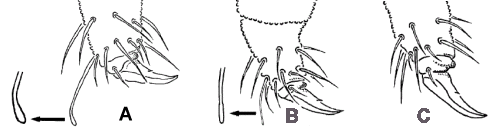 | 2(1). Claw with a strong lateral teeth in basal part (fig.1); fifth abdominal segment with p2 setae (fig.2); fourth abdominal segment with three m-setae and six a-setae (fig.2)... vitalii Claw without lateral teeth; fifth abdominal segment without p2 setae; fourth abdominal segment without m-setae and with four a-setae..................................................... 3 | |