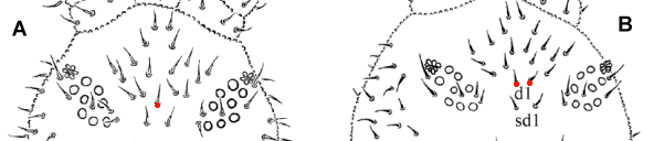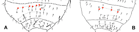 | 9(8). Fifth abdominal segment with p2 setae; fourth abdominal segment with two m-setae; postantennal organ with 14-20 vesicles; second thoracic segment without a2 setae............... dubius Fifth abdominal segment without p2 setae (fig.13b); fourth abdominal segment without m-setae (fig.13b); postantennal organ with 10-12 vesicles (fig.15); second thoracic segment with a2 setae (fig.16)............................... scythicus | |