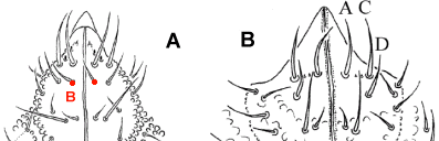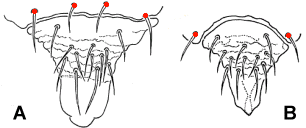 | 7(5). Labium with B setae (fig.11a); d1 setae on head unpaired (fig.12a); fifth abdominal segment without a2 setae... vasylii Labium without B setae (fig.11b); d1 setae on head paired (fig.12b); fifth abdominal segment with a2 setae.... pratensis | |