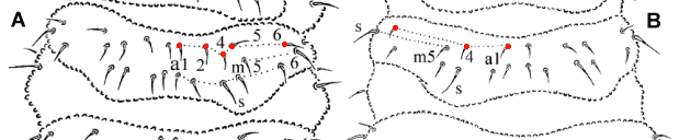 | 8(1). Fourth abdominal segment with m1 setae and six setae in a-row (fig.13a); labium with 2 + 2 organites-x and papillate setae L (fig.14a).......................................... palmiensis Fourth abdominal segment without m1 setae and with four setae in a-row (fig.13b); labium without organites-x and papillate setae L (fig.14b)........................................... 9 | |