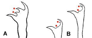 | 6(5). Labral formula: 2/2, 3, 3, 4 (fig.8b); mandible with four teeth, medial tooth small, subapical tooth bigger than medial one (fig.9b); adult specimens without modified setae on fourth antennal segment.............................. parvulus Labral formula: 4/2, 3, 3, 4 (fig.8a); mandible with four teeth, two inner teeth are equal approximately (fig.9a); adult and subadults specimens with a group of 15-18 modified setae on the ventro-apical part of fourth antennal segment (fig.10)........................................... subcrassus | |