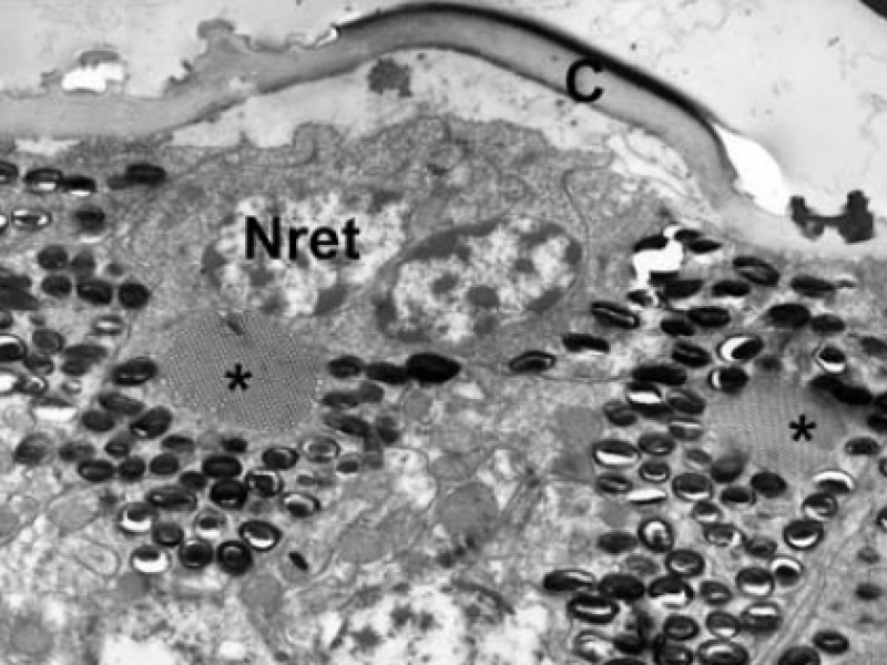 (C = cornea, Nret = retinula cell nucleus, * = rhabdom).