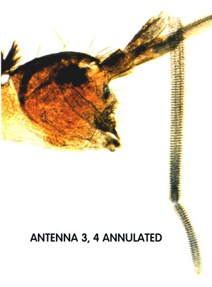 Head and antenna segments 1 and 2 covered with scales. Antenna segments 3 and 4 annulated.